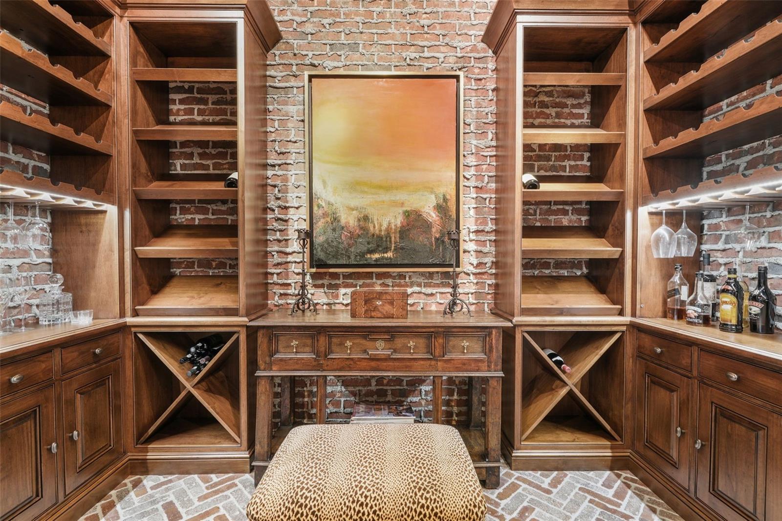 WINE ALCOVE & SITTING AREA: A custom wine alcove with exposed brick, warm wood detailing, and herringbone brick flooring serves as a dramatic focal point and flows into an intimate sitting area designed for conversation and entertaining.