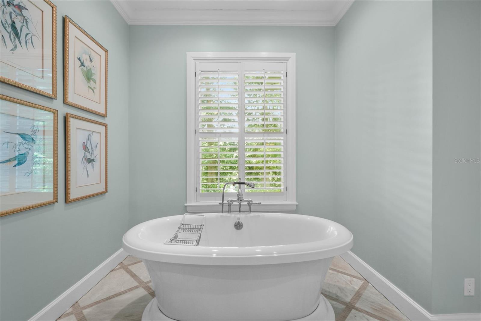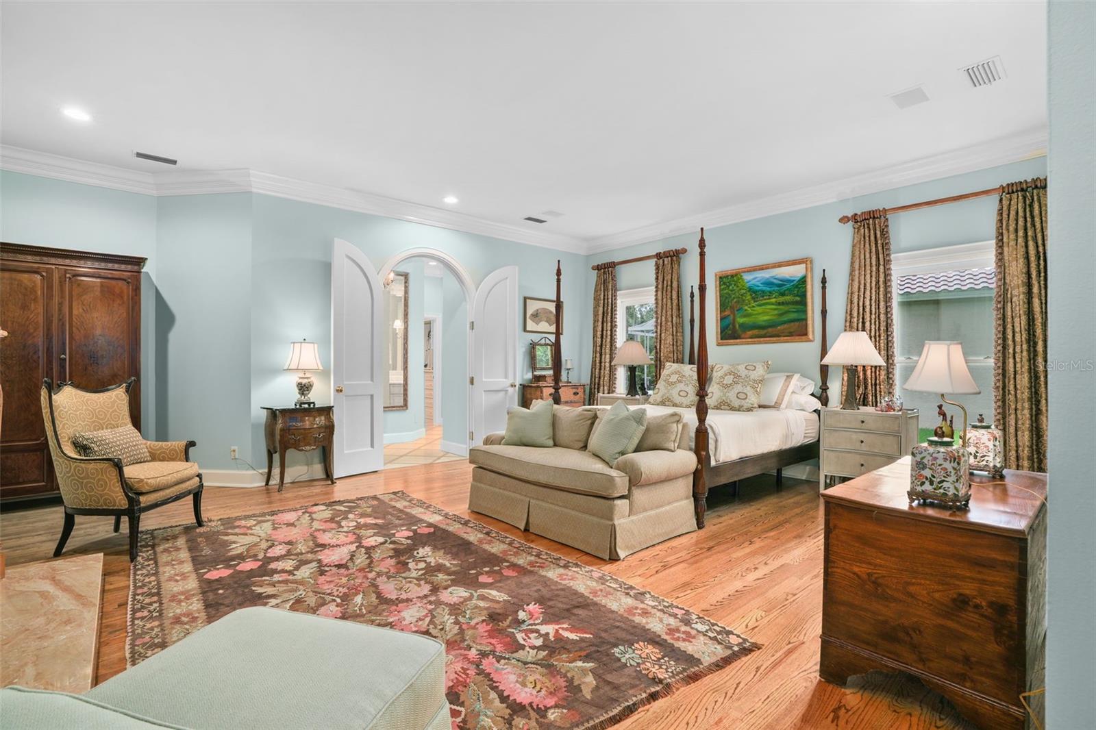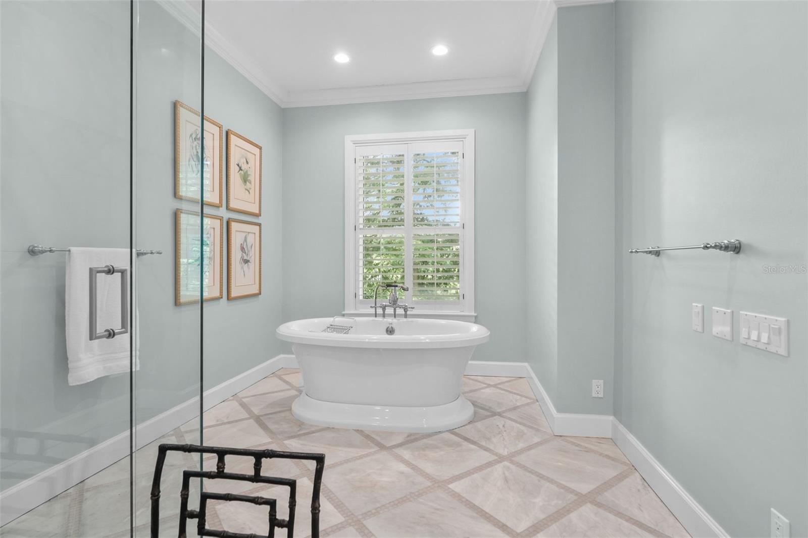 PRIMARY SUITE: Located on the main level, the primary suite features arched doorways, wood floors, crown molding, and beautiful walk-in closets with custom built-ins. The en-suite bath includes a soaking tub, separate glass shower, and marble finishes.