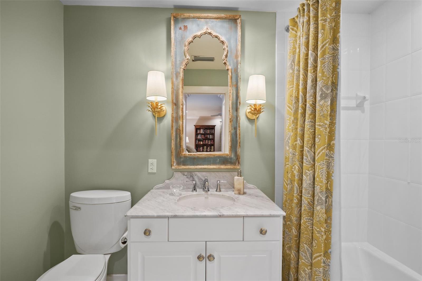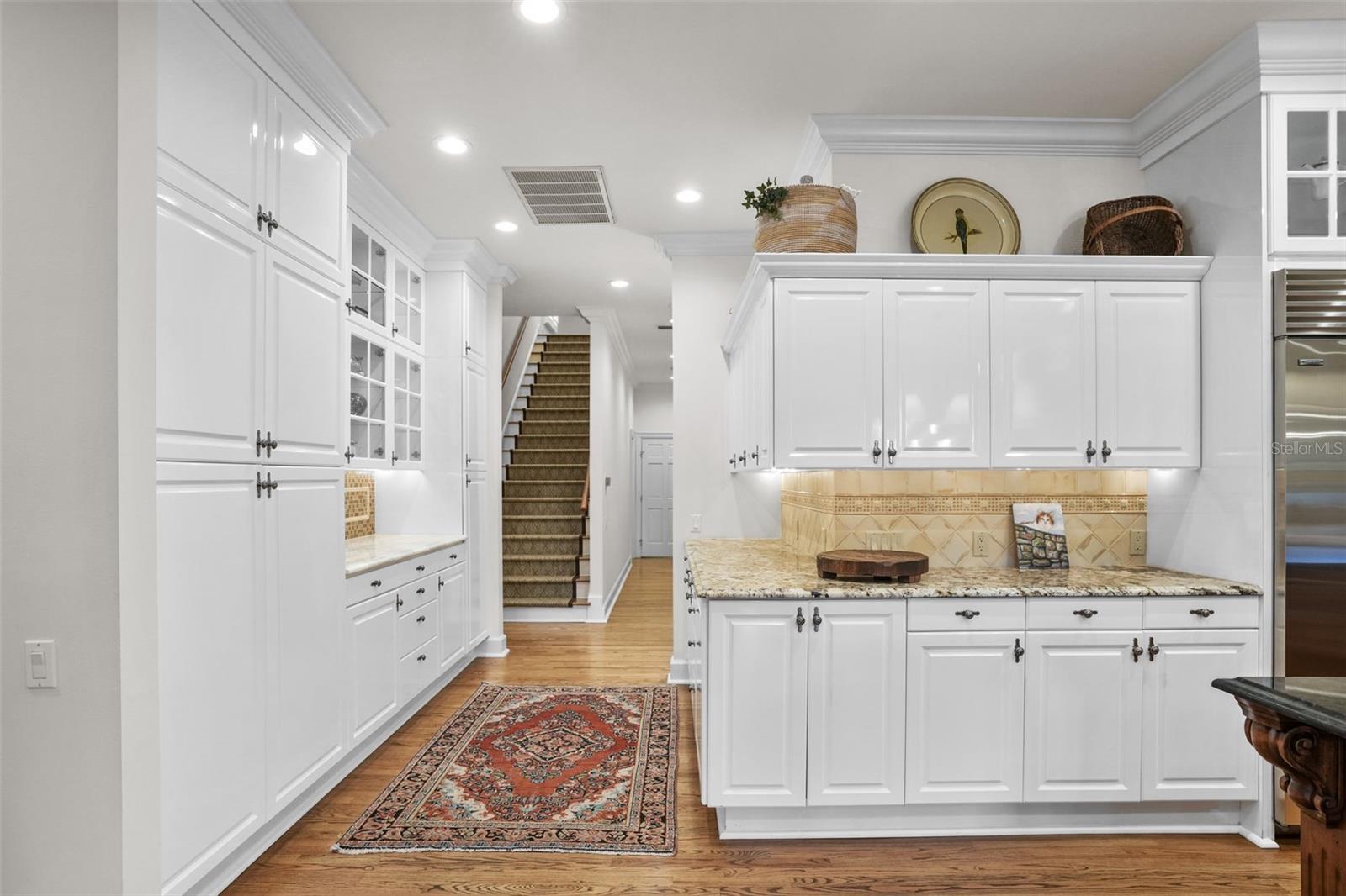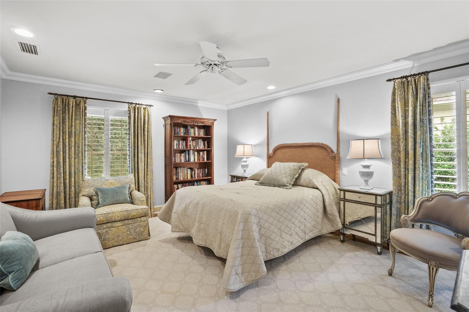 PRIMARY SUITE: Located on the main level, the primary suite features arched doorways, wood floors, crown molding, and beautiful walk-in closets with custom built-ins. The en-suite bath includes a soaking tub, separate glass shower, and marble finishes.