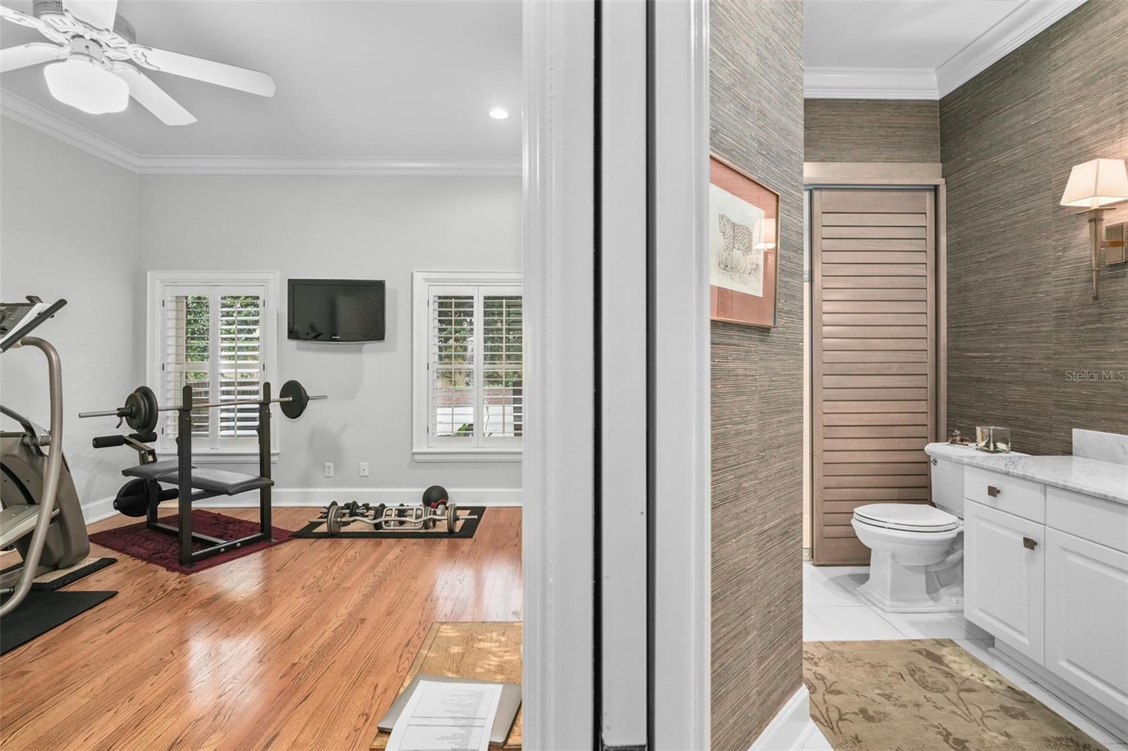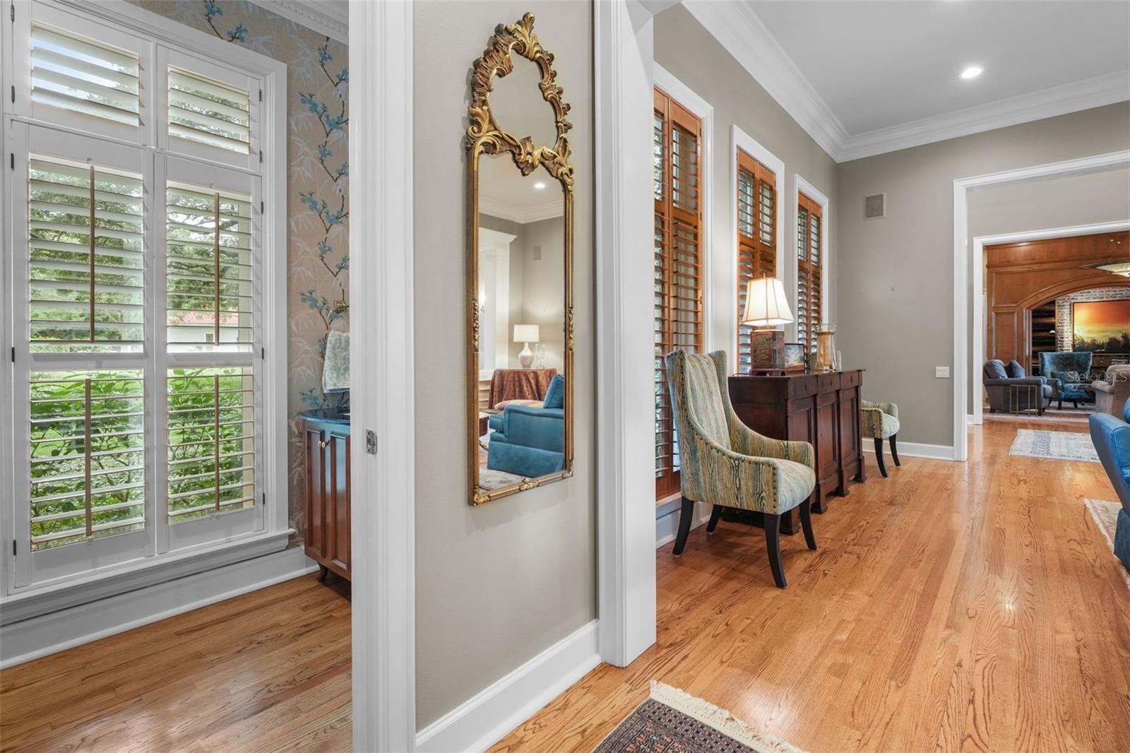 MAIN LIVING SPACES: The main level features a series of interconnected formal and casual spaces that feel open yet well defined. Wood and stone flooring, crown molding, plantation shutters, and windows and glass doors throughout the main level bring in natural light and create a strong connection to the outdoor setting.