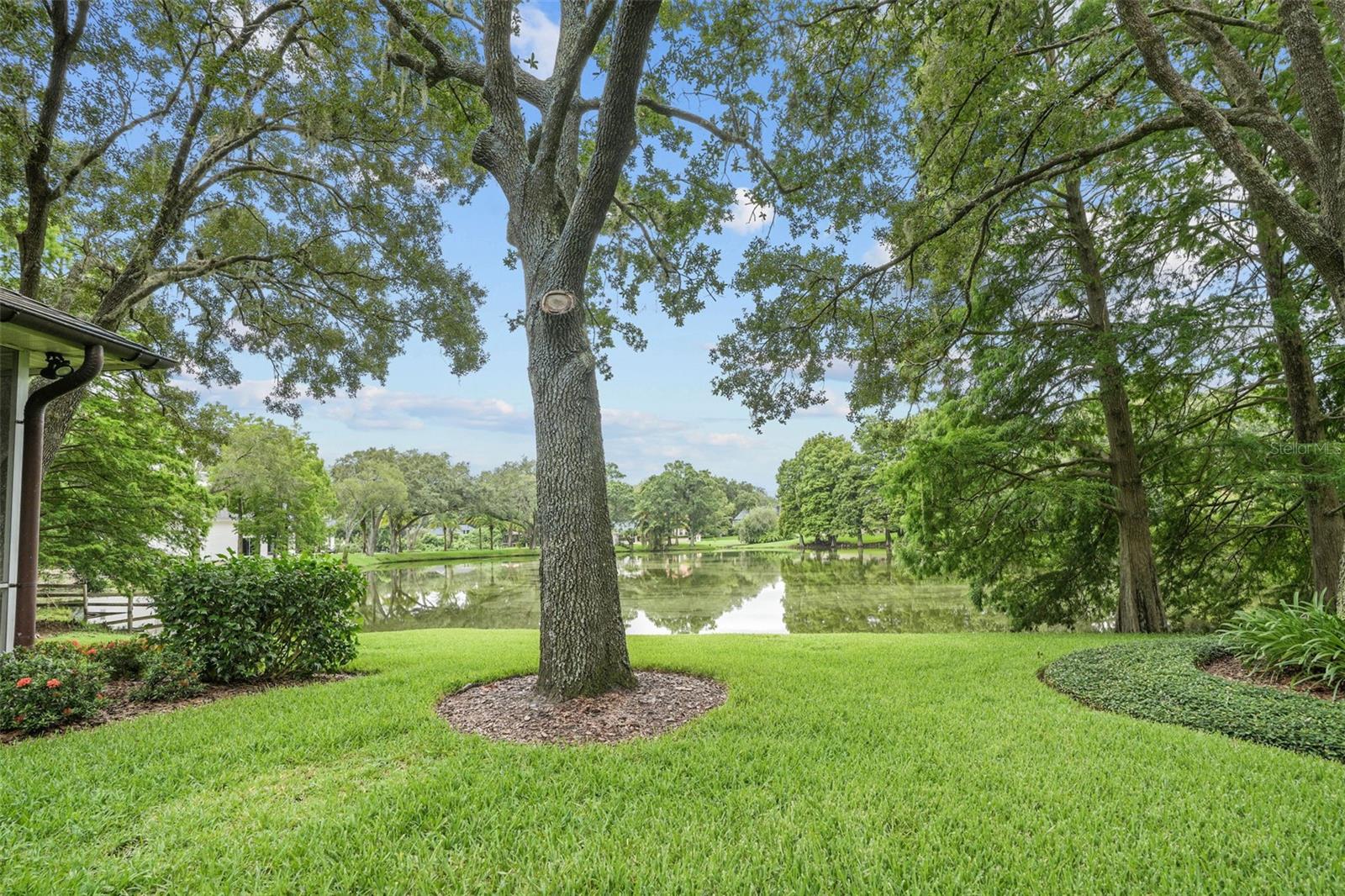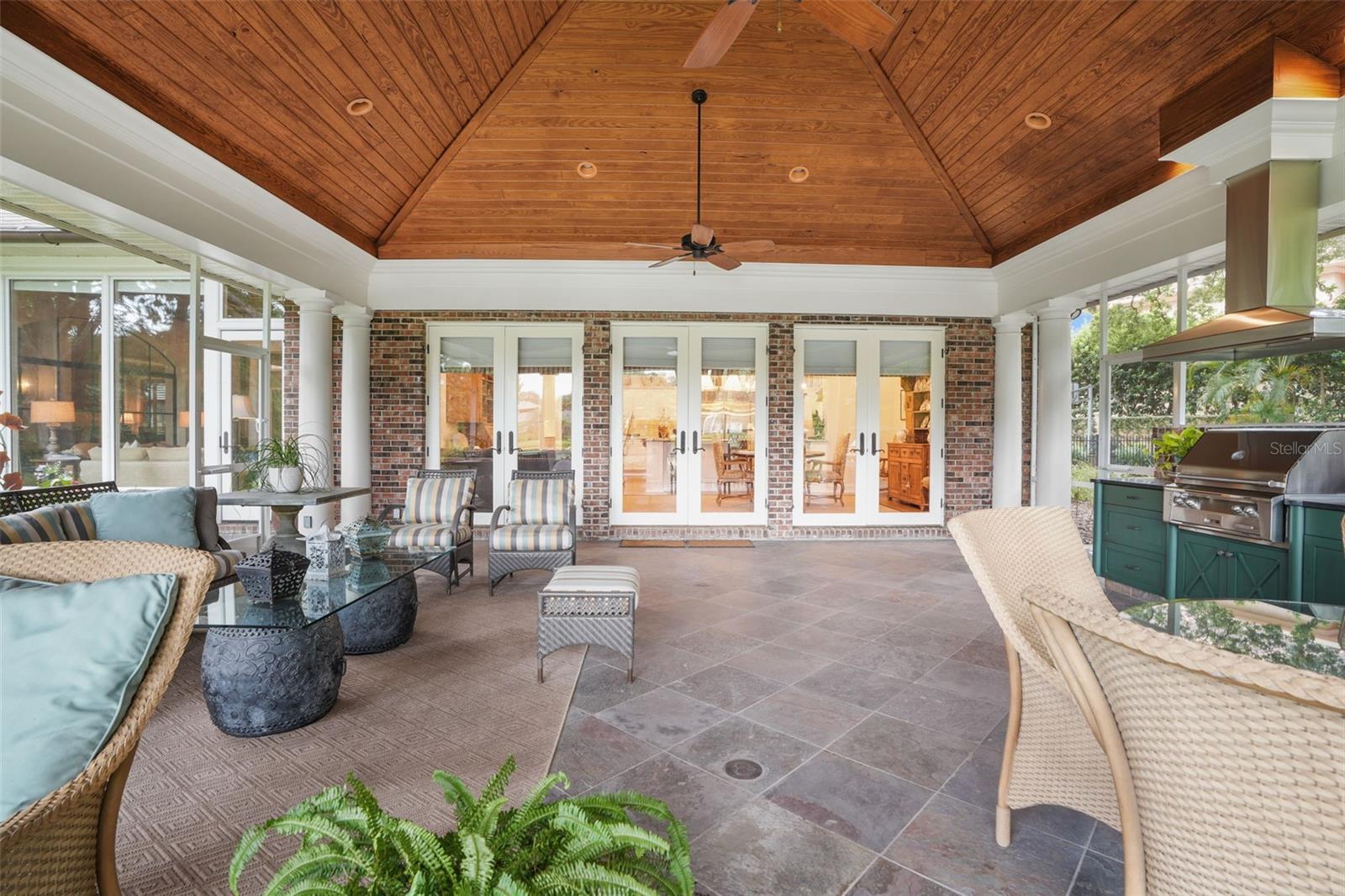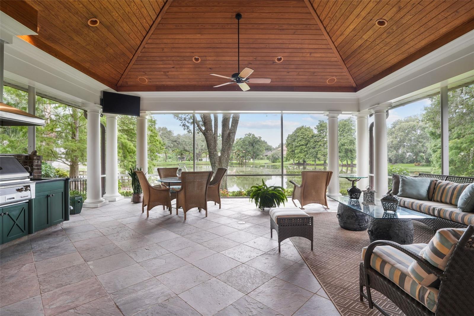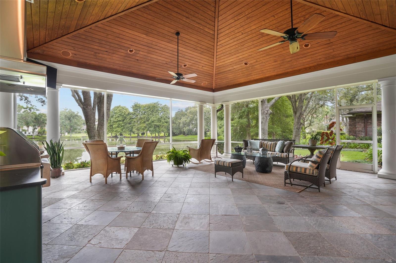 OUTDOOR LIVING & GARAGE: The vaulted screened patio functions as a true outdoor living room, defined by a wood ceiling, slate flooring, and expansive pond views. Thoughtfully designed for both entertaining and everyday enjoyment, this space offers a peaceful extension of the interior living areas, surrounded by mature trees and enhanced landscaping. A 3-car garage provides ample storage and everyday convenience.