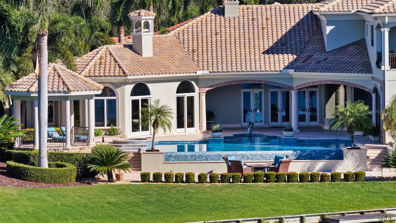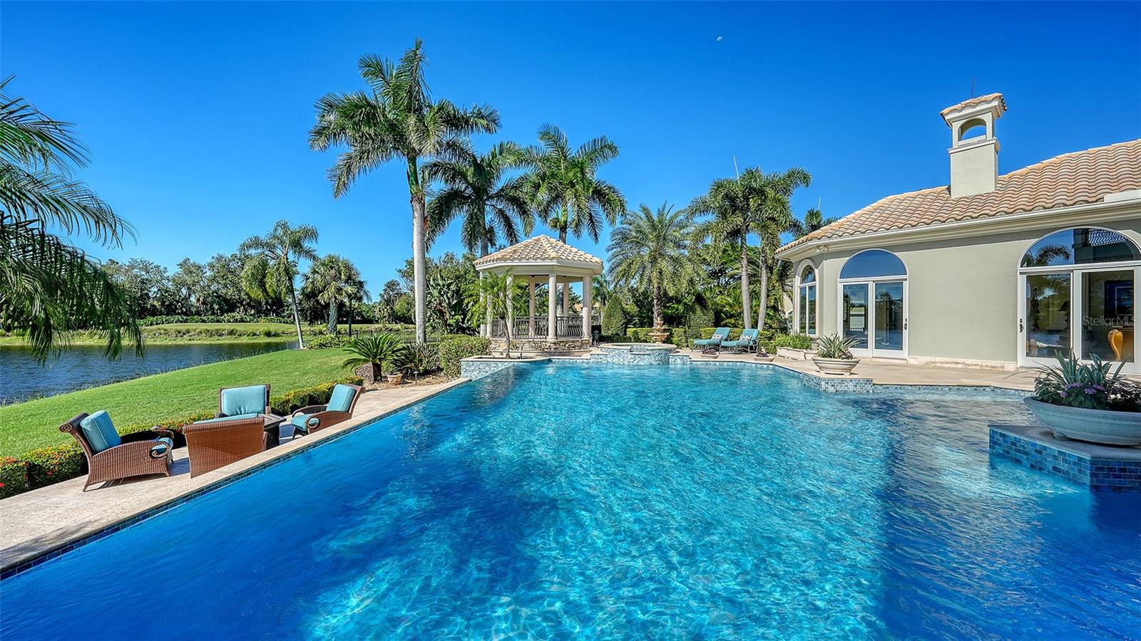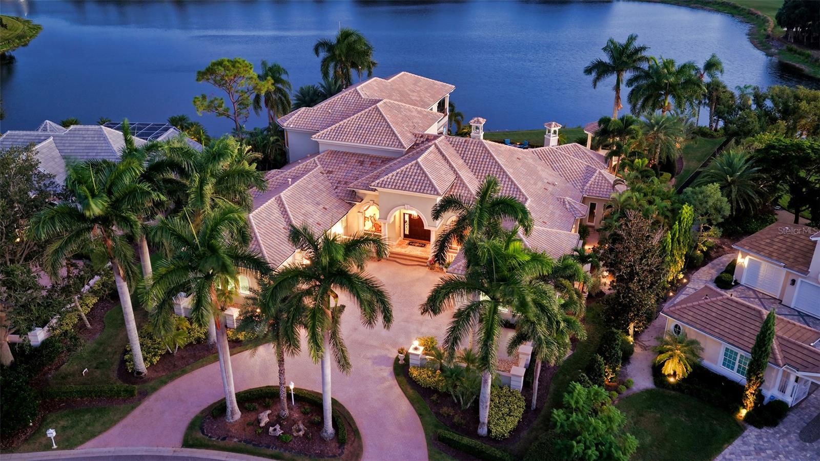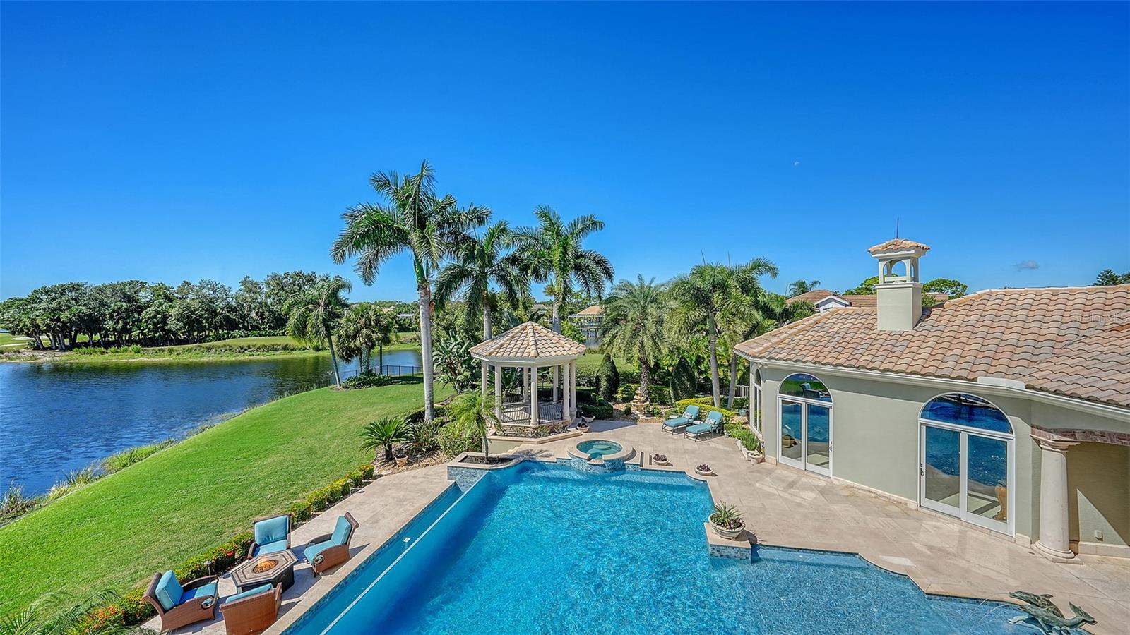 The largest lakefront estate in University Park Country Club, set on nearly ¾ acre offering a rare combination of privacy, golf course views and estate-scale living in one of the most desirable gated communities just minutes from Sarasota. This luxury lakefront residence features an elevator, 4-car air-conditioned garage, resort-style pool and spa, and expansive indoor-outdoor living. Positioned at the end of a quiet cul-de-sac, the property enjoys expansive water views with the golf course beyond—creating a sense of openness and seclusion that is increasingly difficult to replicate. Built by one of Sarasota’s premier builders, the residence is defined by enduring architecture and exceptional craftsmanship, with travertine and walnut-plank flooring, custom millwork, and generous room proportions throughout. Recent updates, including re-surfaced pool & spa, quartz kitchen countertops, fresh interior paint, updated lighting, and window treatments, enhance the home while presenting a compelling opportunity to further modernize to today’s preferences. The chef’s kitchen anchors the home, equipped with custom cabinetry, a Butler’s pantry, and premium appliances including a six-burner Wolf range, Sub-Zero refrigeration, multiple dishwashers, and a built-in Miele coffee system. The first-floor primary suite offers a private retreat with fireplace, custom closets, updated lighting, electronic shades, and direct access to the pool and courtyard. Upstairs, accessible by elevator or grand staircase, are a dedicated theater, expansive bonus room with full bar, guest suite, and covered terrace. Outdoor living is central to the experience, with an infinity-edge pool and spa, gazebo, outdoor kitchen with fireplace, and mature landscaping framing the lakefront setting. Additional features include a golf cart bay, whole-house generator, water filtration system, smart lighting, and fully fenced rear grounds. For buyers seeking a private, estate-scale lakefront property within University Park—where lot size, setting, and construction quality are increasingly rare—this offering presents a compelling opportunity. Conveniently located near University Town Center, fine dining, downtown Sarasota, and SRQ Airport.