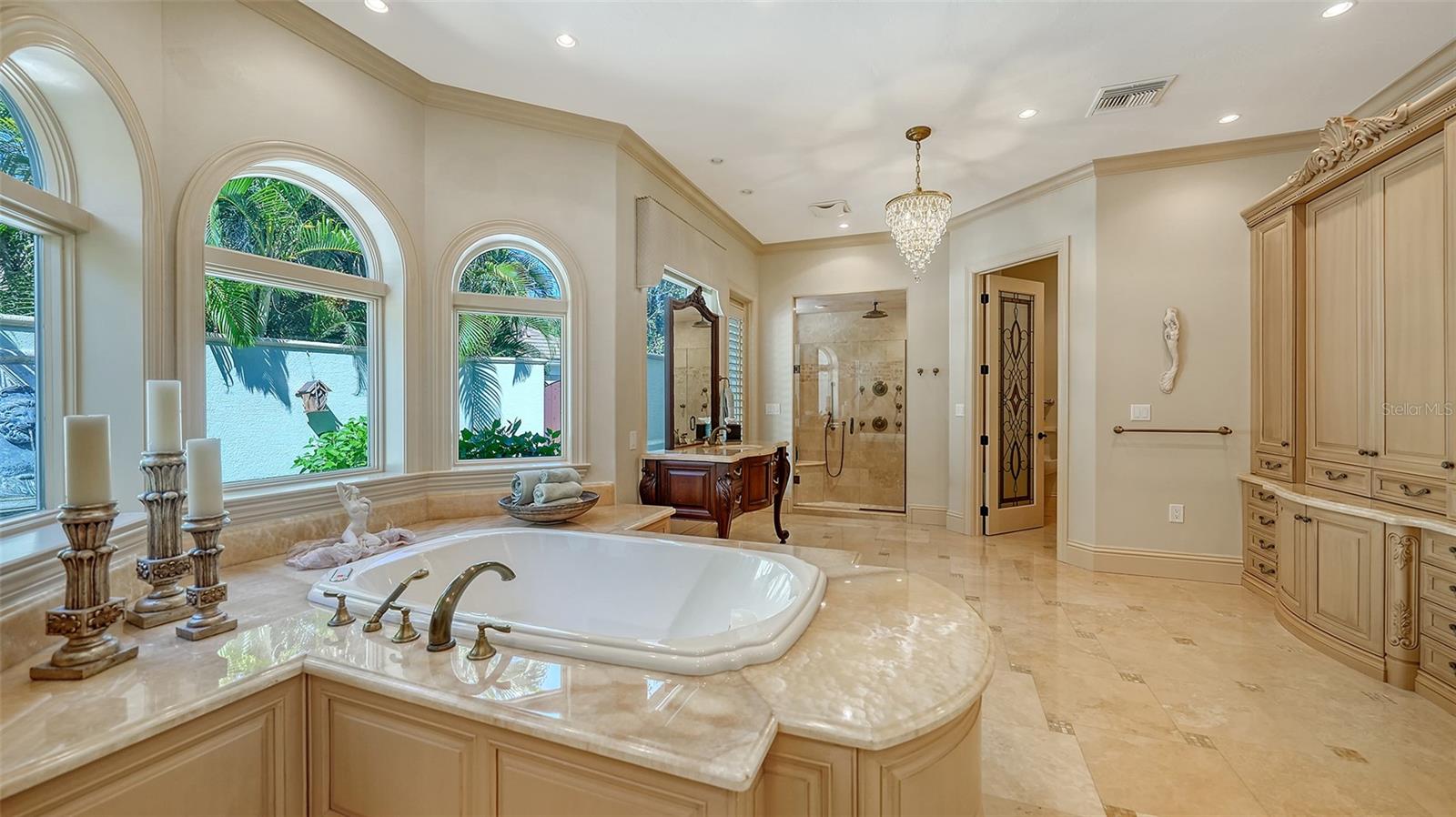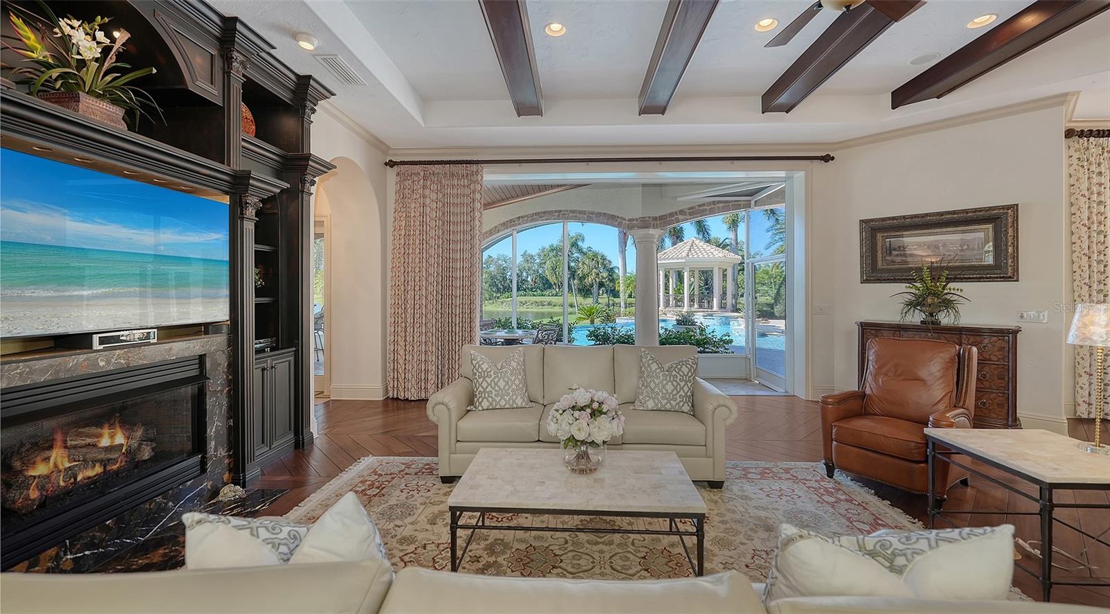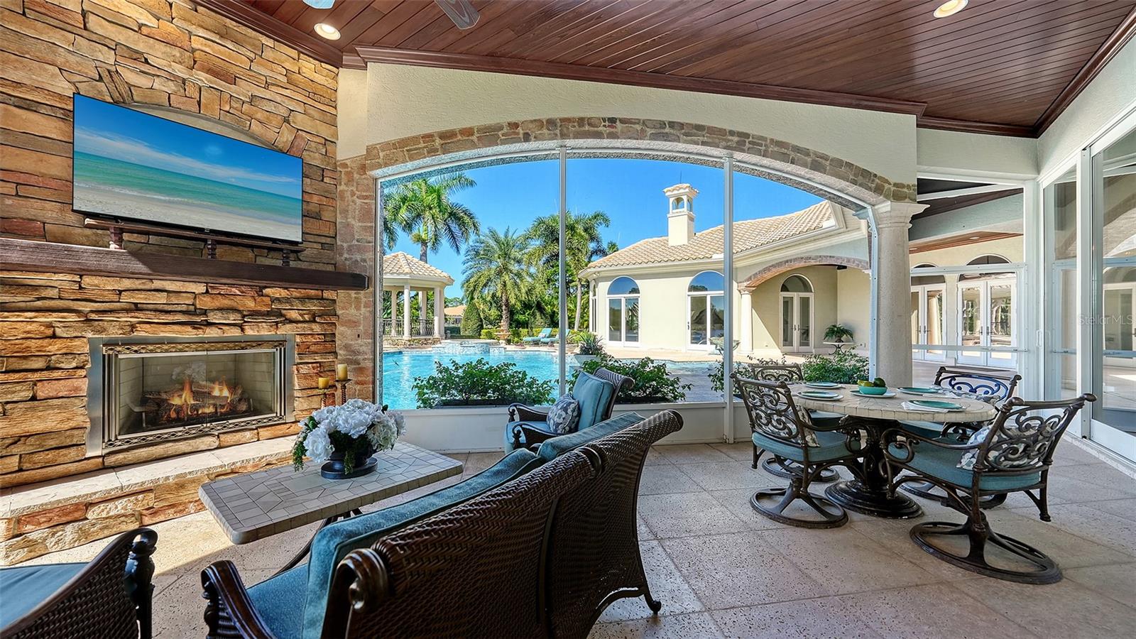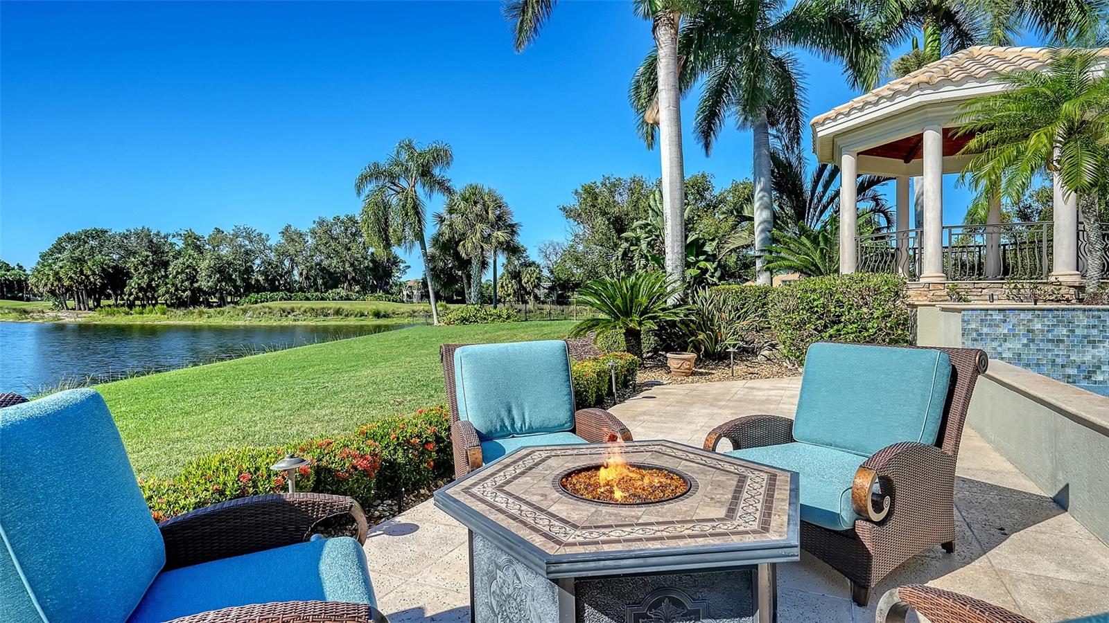 The largest lakefront estate in University Park Country Club, set on nearly ¾ acre offering a rare combination of privacy, golf course views and estate-scale living in one of the most desirable gated communities just minutes from Sarasota. This luxury lakefront residence features an elevator, 4-car air-conditioned garage, resort-style pool and spa, and expansive indoor-outdoor living. Positioned at the end of a quiet cul-de-sac, the property enjoys expansive water views with the golf course beyond—creating a sense of openness and seclusion that is increasingly difficult to replicate. Built by one of Sarasota’s premier builders, the residence is defined by enduring architecture and exceptional craftsmanship, with travertine and walnut-plank flooring, custom millwork, and generous room proportions throughout. Recent updates, including re-surfaced pool & spa, quartz kitchen countertops, fresh interior paint, updated lighting, and window treatments, enhance the home while presenting a compelling opportunity to further modernize to today’s preferences. The chef’s kitchen anchors the home, equipped with custom cabinetry, a Butler’s pantry, and premium appliances including a six-burner Wolf range, Sub-Zero refrigeration, multiple dishwashers, and a built-in Miele coffee system. The first-floor primary suite offers a private retreat with fireplace, custom closets, updated lighting, electronic shades, and direct access to the pool and courtyard. Upstairs, accessible by elevator or grand staircase, are a dedicated theater, expansive bonus room with full bar, guest suite, and covered terrace. Outdoor living is central to the experience, with an infinity-edge pool and spa, gazebo, outdoor kitchen with fireplace, and mature landscaping framing the lakefront setting. Additional features include a golf cart bay, whole-house generator, water filtration system, smart lighting, and fully fenced rear grounds. For buyers seeking a private, estate-scale lakefront property within University Park—where lot size, setting, and construction quality are increasingly rare—this offering presents a compelling opportunity. Conveniently located near University Town Center, fine dining, downtown Sarasota, and SRQ Airport.