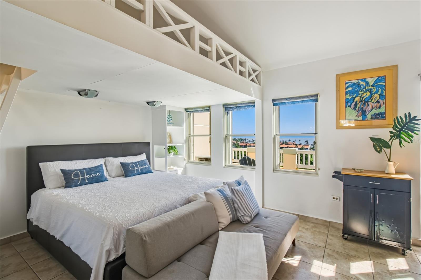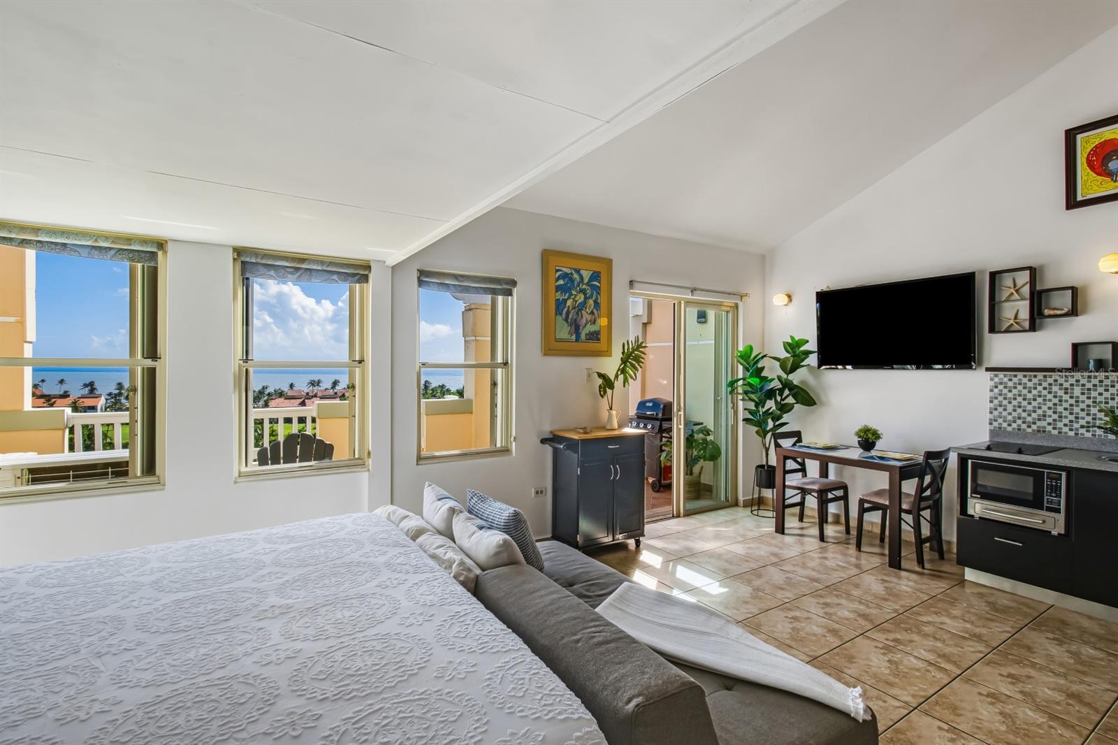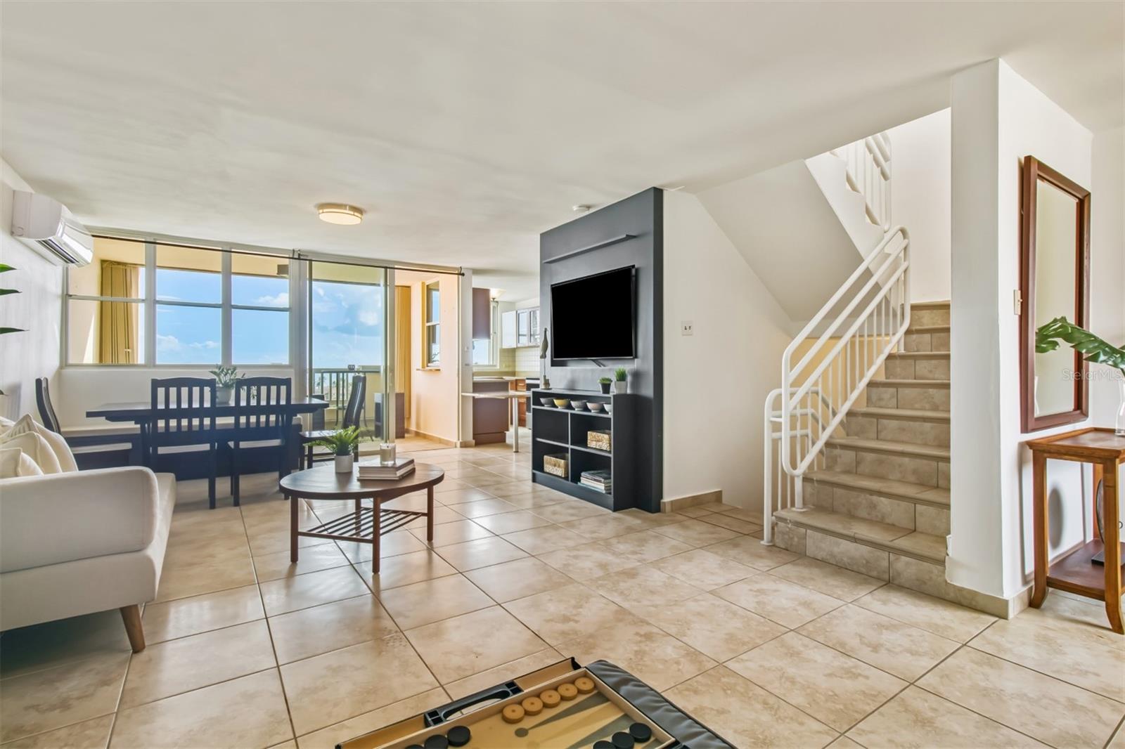 Spanning approximately 2,400 square feet across three levels, this expansive home embraces indoor-outdoor living with three spacious terraces and a thoughtfully designed layout that provides excellent cross-ventilation and panoramic ocean vistas from nearly every vantage point. The main entrance is located on the second level and features a bright, open concept layout, including a spacious living and dining area, a full bathroom and a vast kitchen that opens onto a small terrace with unobstructed views of the turquoise waters beyond.