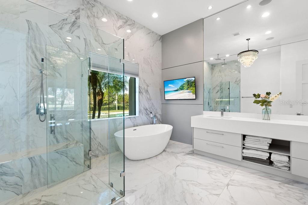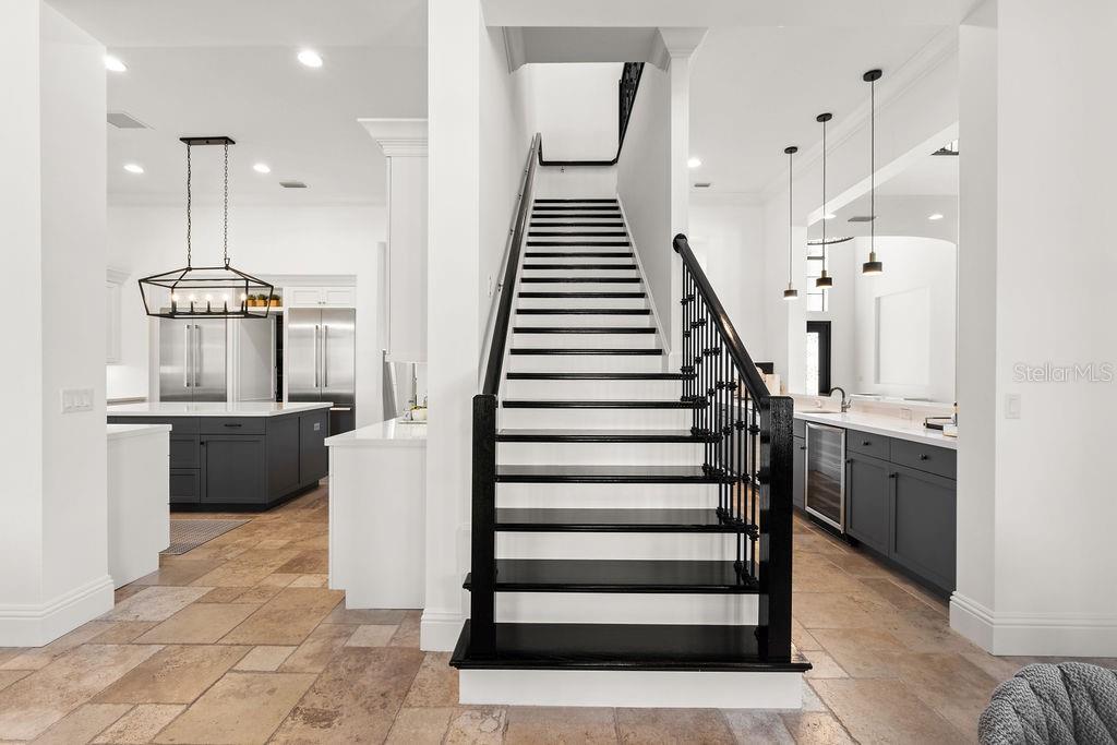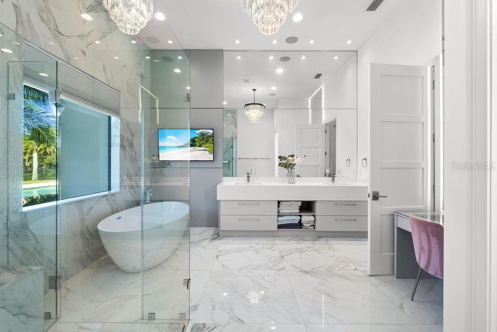 At the heart of the home, the chef’s kitchen is a true showpiece, appointed with top-of-the-line appliances, custom cabinetry, an oversized island, and seamless flow into the main living and entertaining areas. Expansive windows and sliding glass doors flood the interiors with natural light while framing tranquil water views.