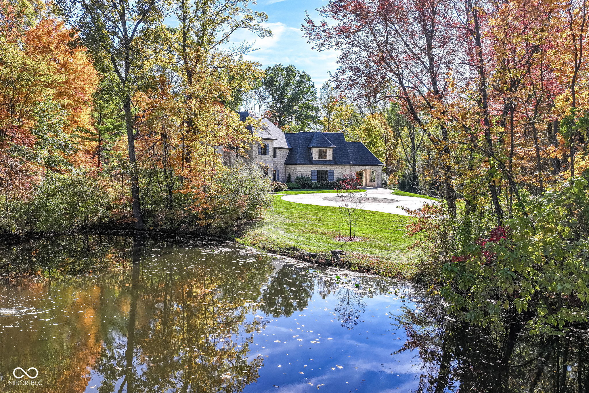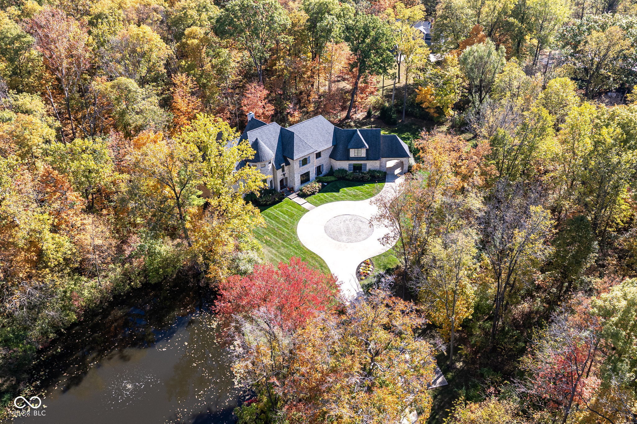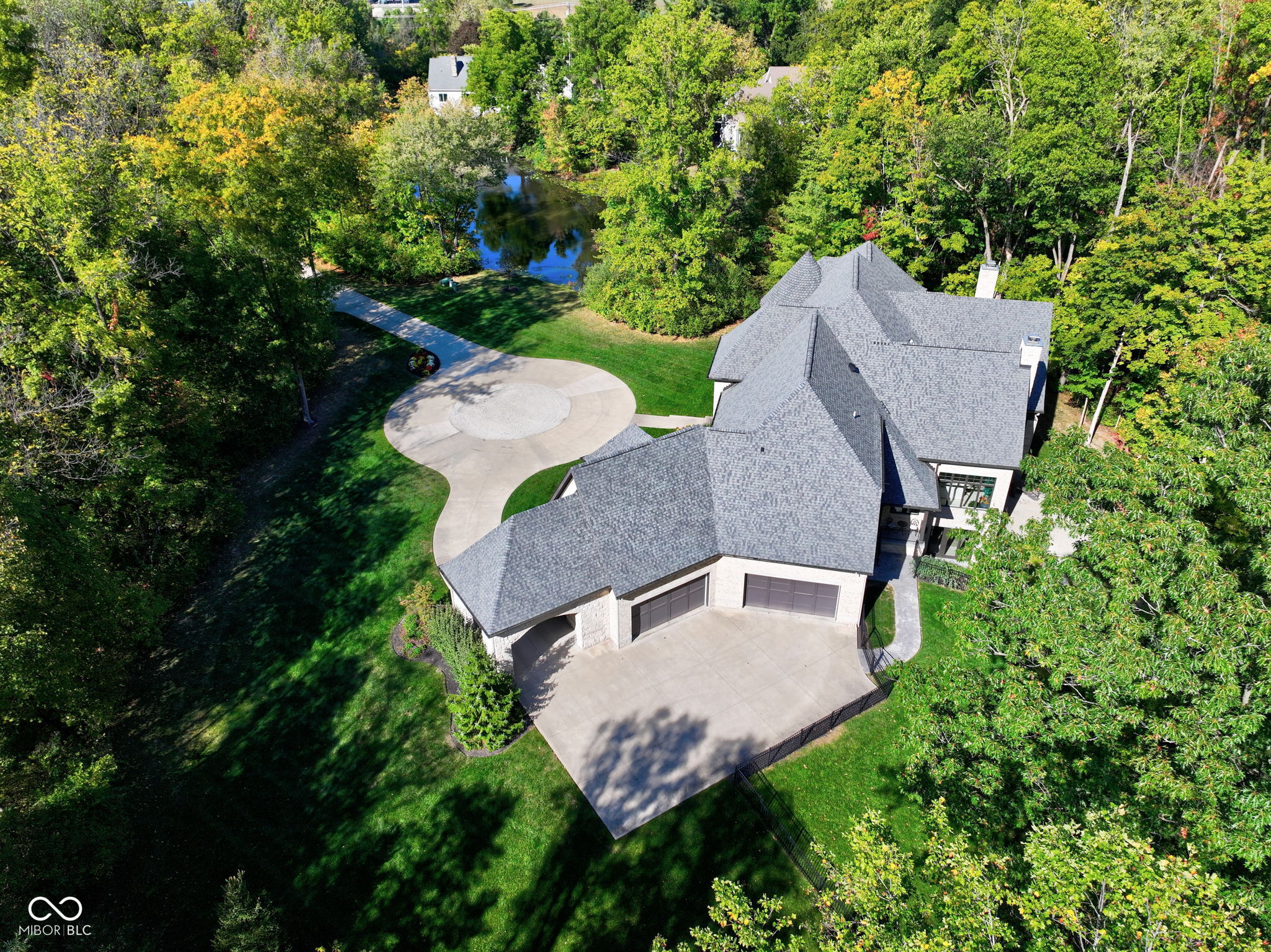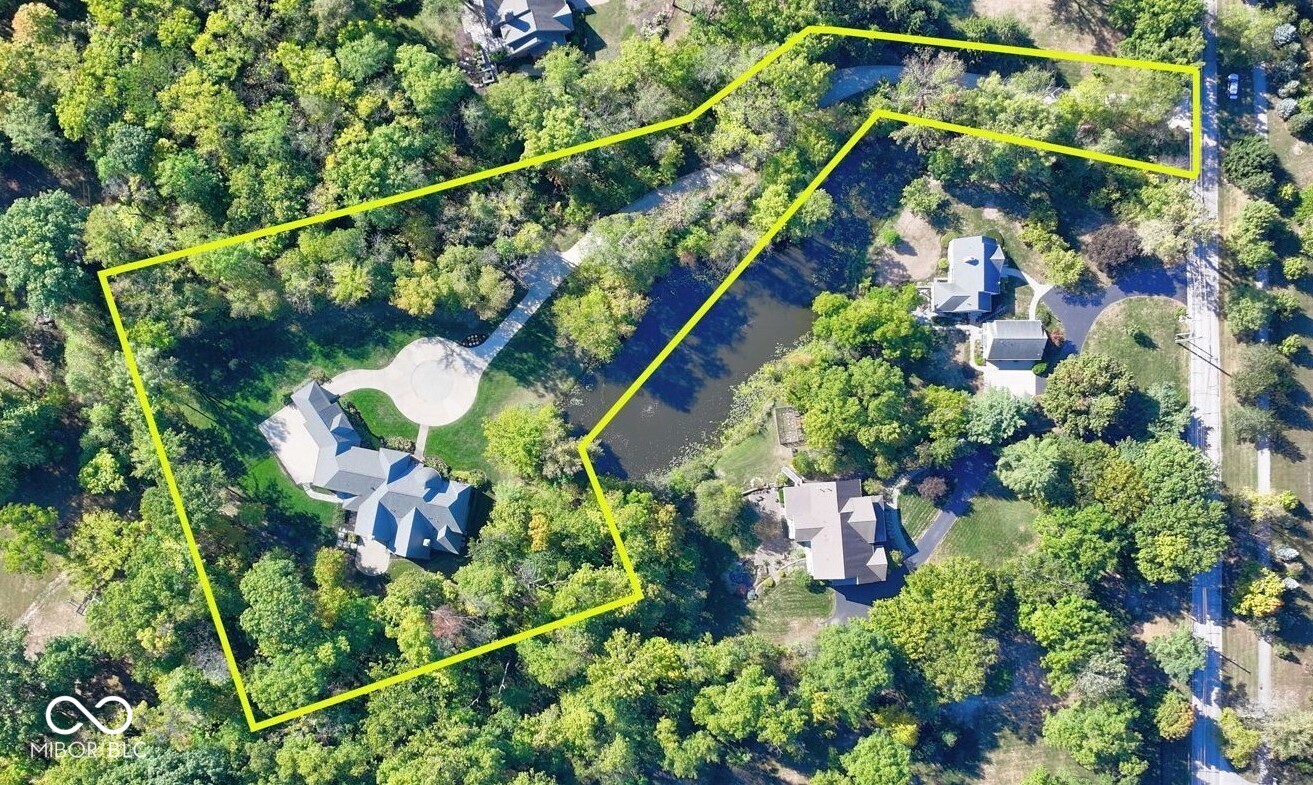 Exceptional custom home by Christopher Scott Homes on 4.15 wooded acres w shared pond in the heart of Zionsville. The wooded lot, set away from the road, offers privacy, but very convenient to Zionsville's charming village restaurants & shops, and top notch Zionsville schools. Spectacular French Country beauty built new in 2018, thoughtfully designed, well maintained, and one owner. 10,384sf, light & bright, travertine & white oak floors, vaulted ceilings w gorgeous beams, 5-6 Bedrooms, 5 Full & 3 Half Baths, 4 car garage. Enter the front double doors into the spacious Foyer w 20' ceiling & travertine floors. Follow the beautiful stone floors into the main entertaining area featuring the Great Room w lovely fireplace & vaulted ceilings w wood beams. Kitchen is perfect for entertaining w 12' island, Amish maple cabinets, Thermador appliances including Double Refrigerator, Double Ovens, 2 Dishwashers, Induction Cooktop w Limestone Hooded Vent. Spacious Dining Area & built-in banquette Breakfast seating offer many places to gather. Adjacent 625sf Porch w vaulted wooden ceiling, fireplace, grill, fan, heater & Phantom auto screens adds lovely outdoor space. Also on the main level is the Primary Suite and Office. Upstairs, 3-4 BR, 3 Full Baths & Bonus Room. Lower Level offers lots of room for entertaining w large Recreation space that includes pool table, shuffle board, 3 TV's plus Bar w 2 more TV's. Beautiful Bar has a limestone countertop with leather finish, refrigerator, 2 sinks, dishwasher & ice maker. Steps away is the temperature & humidity-controlled wine room w 500 bottle capacity. Plus Exercise Room, BR & Bath, large storage area, & walk-out to the backyard. 1,356sf 4-car garage features EV plug, 3 large storage closets, perfect for bicycles, strollers, golf clubs, gardening equipment & more. Backyard offers a fenced yard for pets and play, plus more yard, lovely woods, and shared pond to enjoy. Eagle Elementary, Zionsville MS, Zionsville High