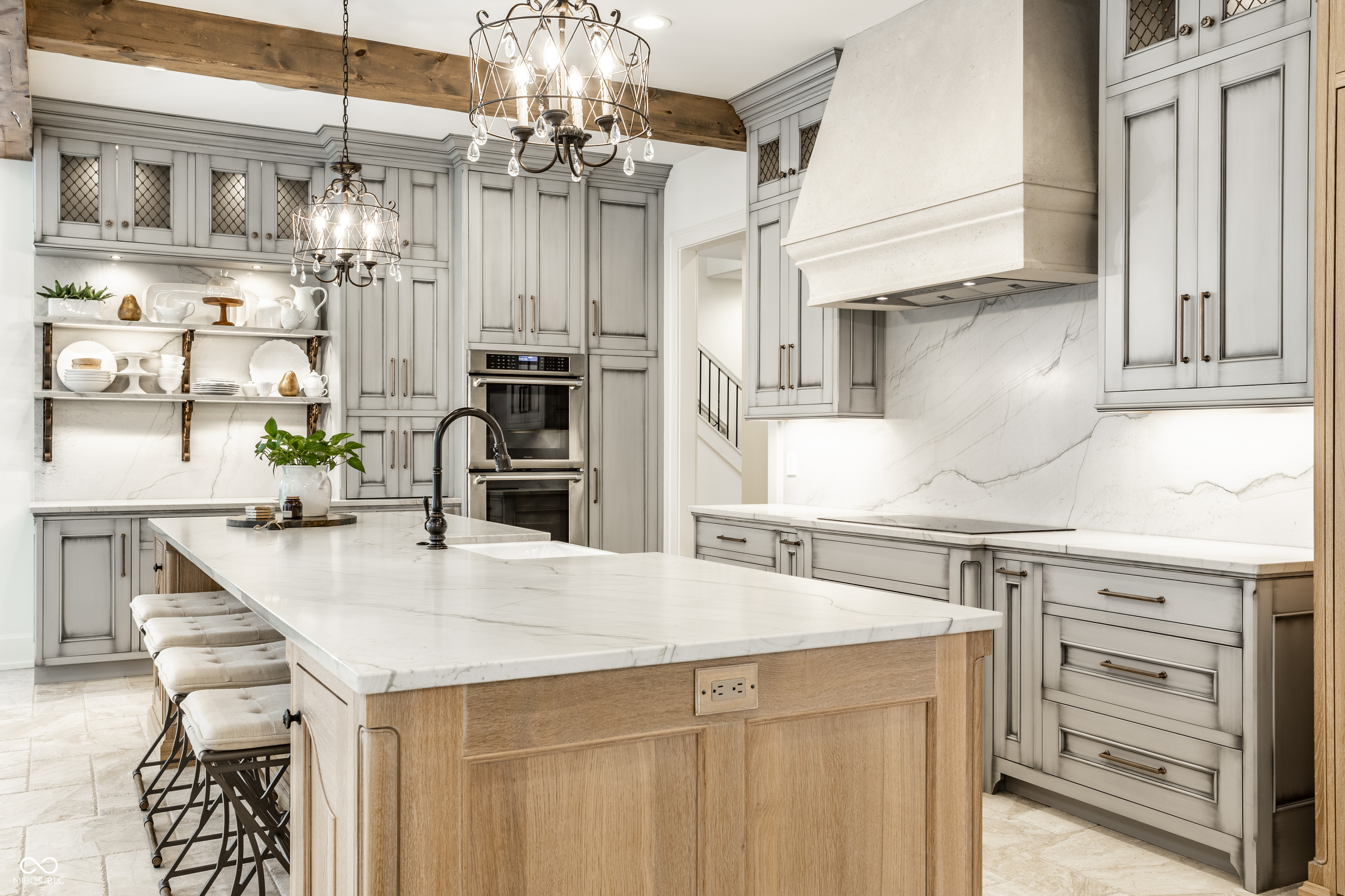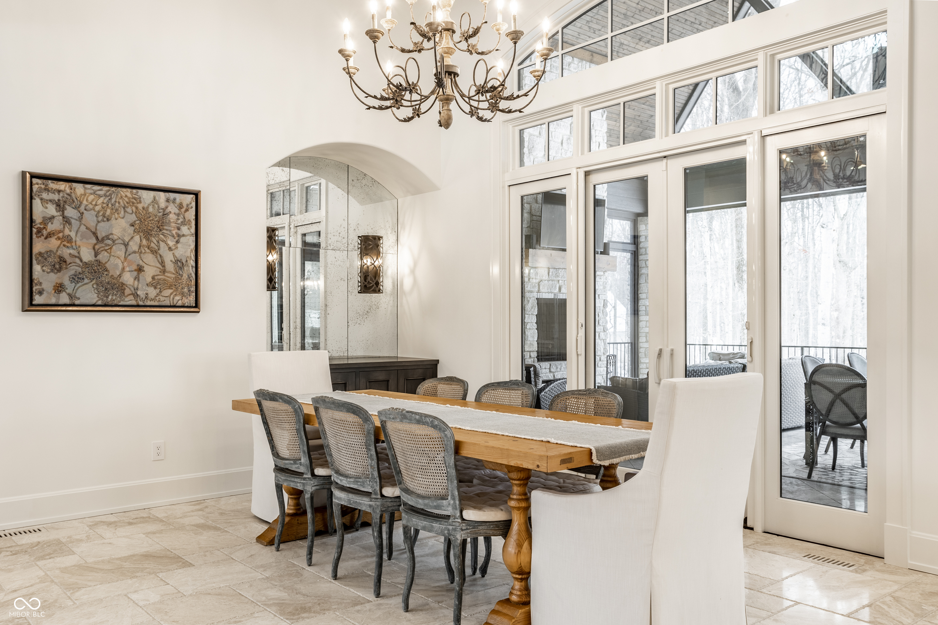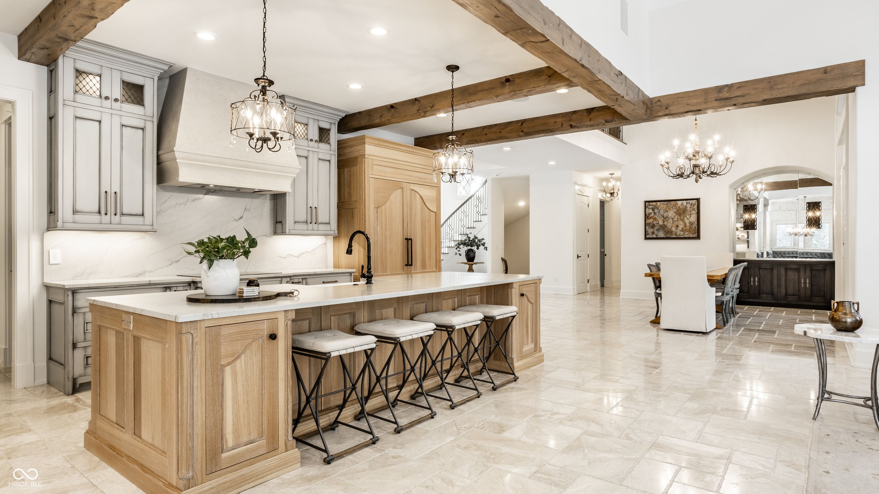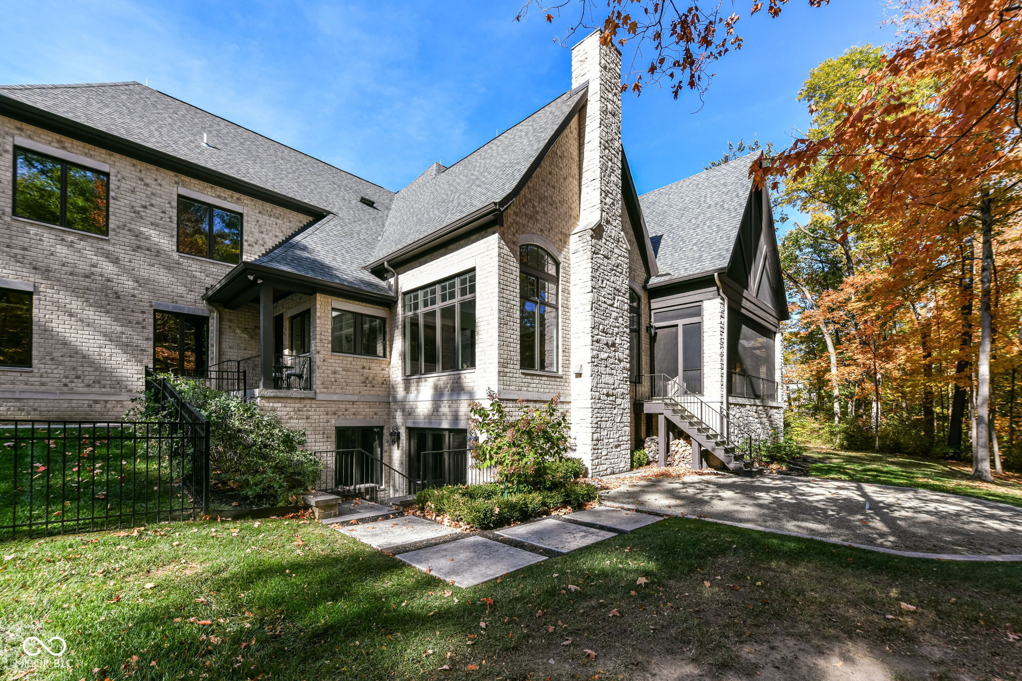 Exceptional custom home by Christopher Scott Homes on 4.15 wooded acres w shared pond in the heart of Zionsville. The wooded lot, set away from the road, offers privacy, but very convenient to Zionsville's charming village restaurants & shops, and top notch Zionsville schools. Spectacular French Country beauty built new in 2018, thoughtfully designed, well maintained, and one owner. 10,384sf, light & bright, travertine & white oak floors, vaulted ceilings w gorgeous beams, 5-6 Bedrooms, 5 Full & 3 Half Baths, 4 car garage. Enter the front double doors into the spacious Foyer w 20' ceiling & travertine floors. Follow the beautiful stone floors into the main entertaining area featuring the Great Room w lovely fireplace & vaulted ceilings w wood beams. Kitchen is perfect for entertaining w 12' island, Amish maple cabinets, Thermador appliances including Double Refrigerator, Double Ovens, 2 Dishwashers, Induction Cooktop w Limestone Hooded Vent. Spacious Dining Area & built-in banquette Breakfast seating offer many places to gather. Adjacent 625sf Porch w vaulted wooden ceiling, fireplace, grill, fan, heater & Phantom auto screens adds lovely outdoor space. Also on the main level is the Primary Suite and Office. Upstairs, 3-4 BR, 3 Full Baths & Bonus Room. Lower Level offers lots of room for entertaining w large Recreation space that includes pool table, shuffle board, 3 TV's plus Bar w 2 more TV's. Beautiful Bar has a limestone countertop with leather finish, refrigerator, 2 sinks, dishwasher & ice maker. Steps away is the temperature & humidity-controlled wine room w 500 bottle capacity. Plus Exercise Room, BR & Bath, large storage area, & walk-out to the backyard. 1,356sf 4-car garage features EV plug, 3 large storage closets, perfect for bicycles, strollers, golf clubs, gardening equipment & more. Backyard offers a fenced yard for pets and play, plus more yard, lovely woods, and shared pond to enjoy. Eagle Elementary, Zionsville MS, Zionsville High