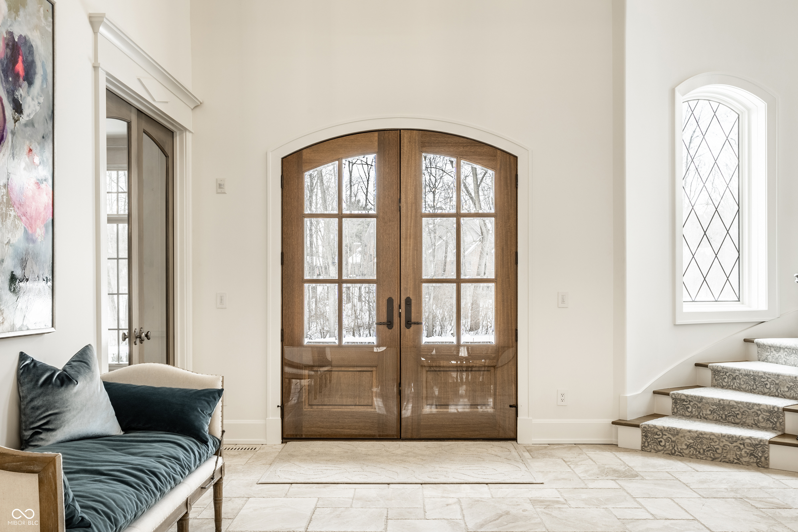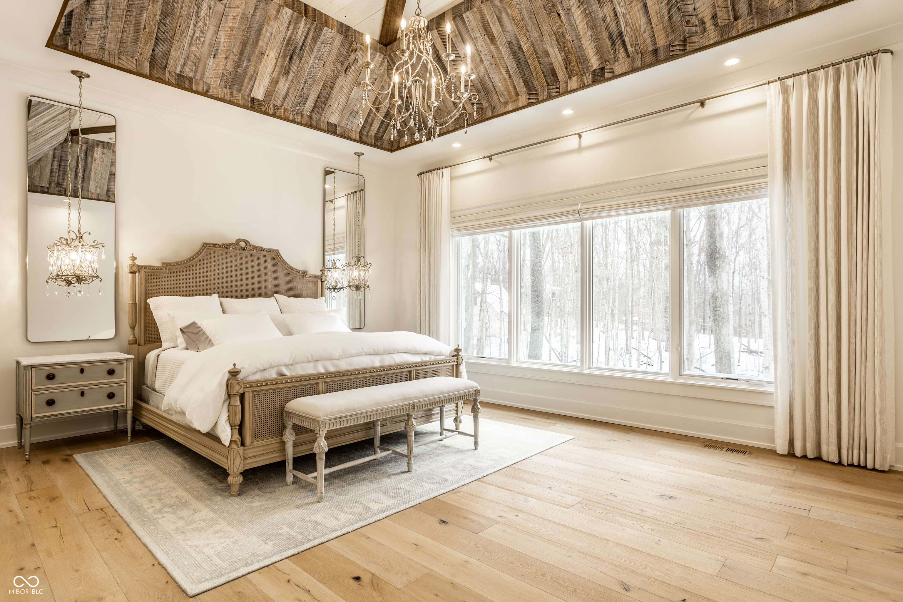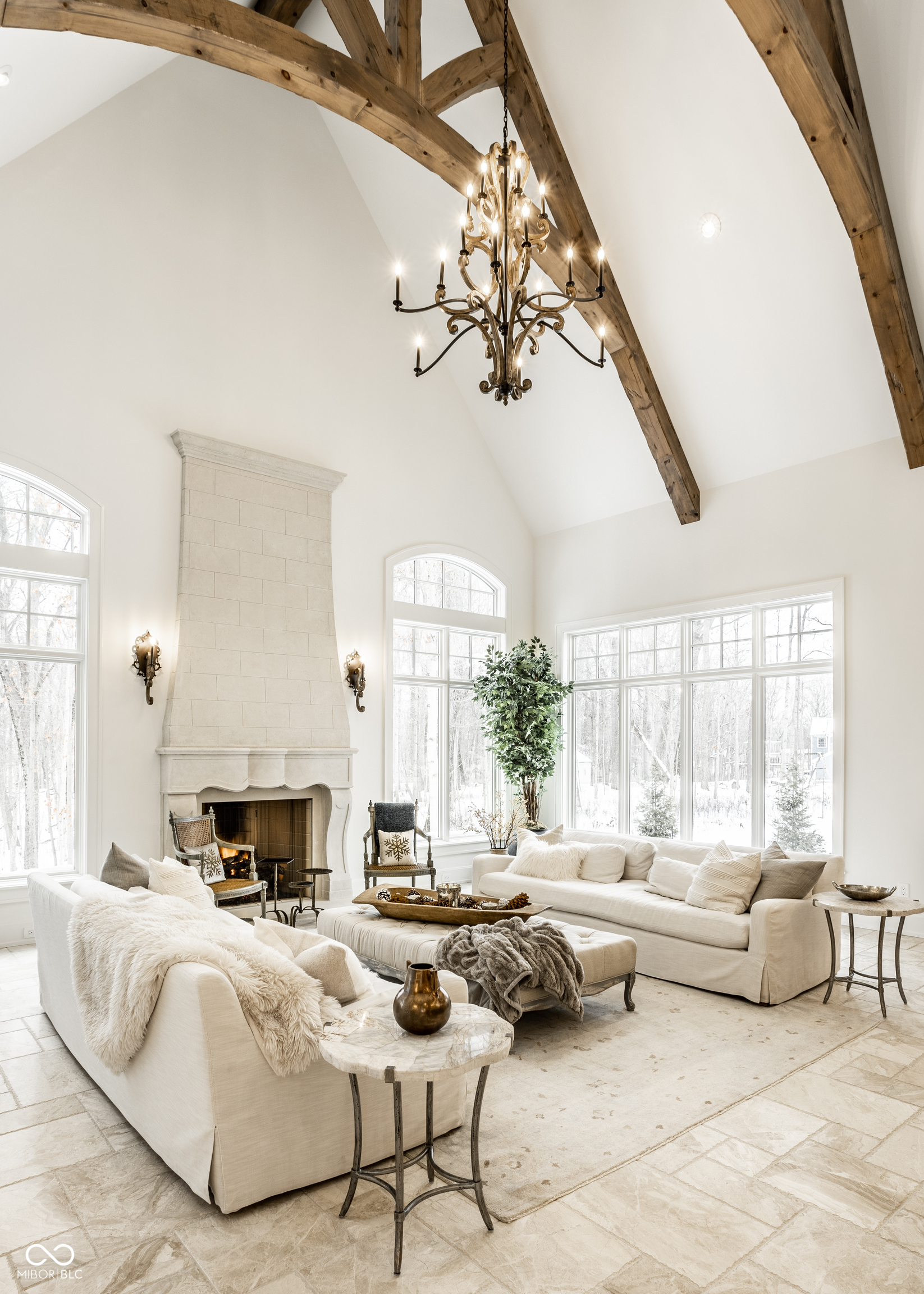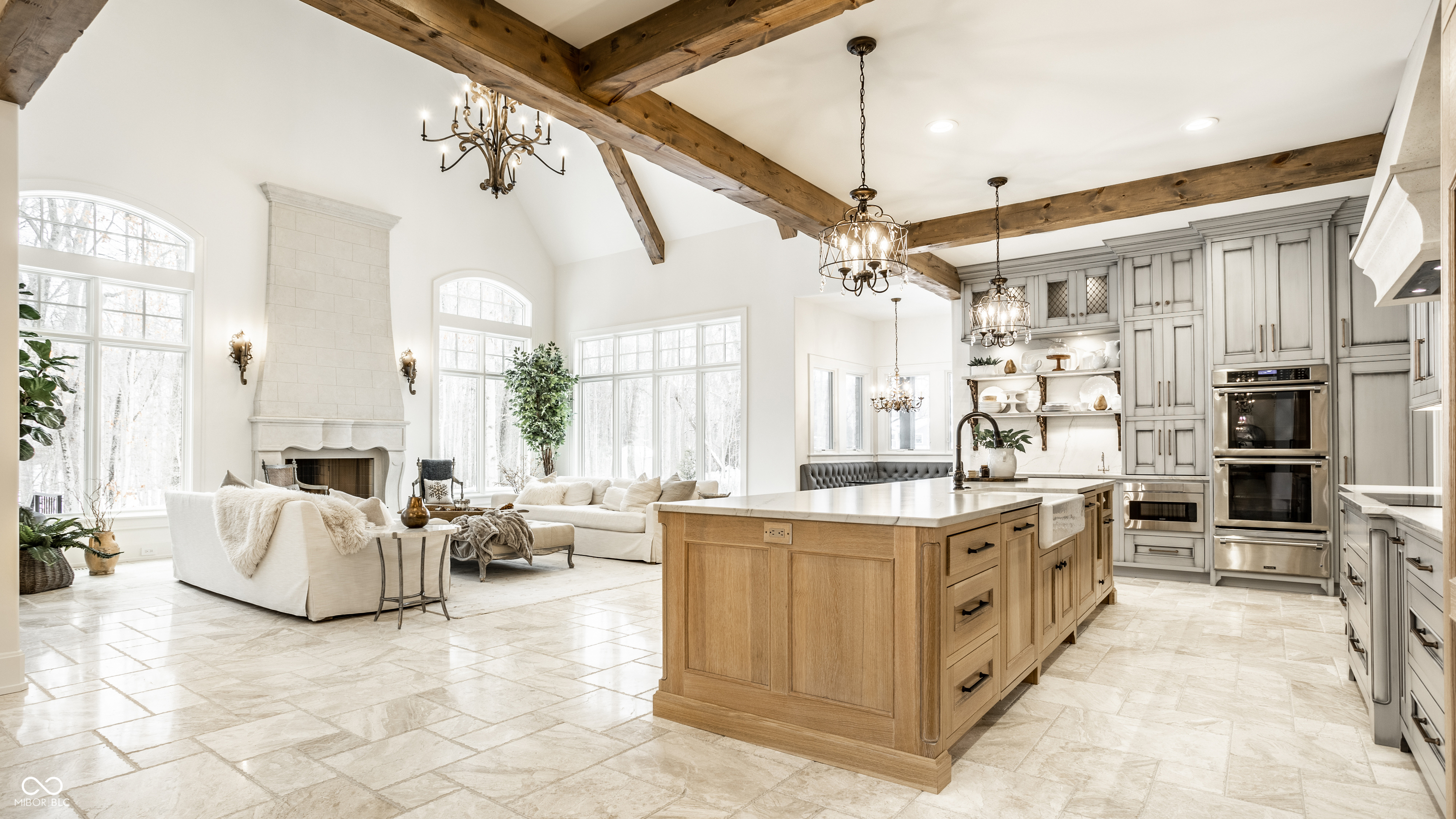 Exceptional custom home by Christopher Scott Homes on 4.15 wooded acres w shared pond in the heart of Zionsville. The wooded lot, set away from the road, offers privacy, but very convenient to Zionsville's charming village restaurants & shops, and top notch Zionsville schools. Spectacular French Country beauty built new in 2018, thoughtfully designed, well maintained, and one owner. 10,384sf, light & bright, travertine & white oak floors, vaulted ceilings w gorgeous beams, 5-6 Bedrooms, 5 Full & 3 Half Baths, 4 car garage. Enter the front double doors into the spacious Foyer w 20' ceiling & travertine floors. Follow the beautiful stone floors into the main entertaining area featuring the Great Room w lovely fireplace & vaulted ceilings w wood beams. Kitchen is perfect for entertaining w 12' island, Amish maple cabinets, Thermador appliances including Double Refrigerator, Double Ovens, 2 Dishwashers, Induction Cooktop w Limestone Hooded Vent. Spacious Dining Area & built-in banquette Breakfast seating offer many places to gather. Adjacent 625sf Porch w vaulted wooden ceiling, fireplace, grill, fan, heater & Phantom auto screens adds lovely outdoor space. Also on the main level is the Primary Suite and Office. Upstairs, 3-4 BR, 3 Full Baths & Bonus Room. Lower Level offers lots of room for entertaining w large Recreation space that includes pool table, shuffle board, 3 TV's plus Bar w 2 more TV's. Beautiful Bar has a limestone countertop with leather finish, refrigerator, 2 sinks, dishwasher & ice maker. Steps away is the temperature & humidity-controlled wine room w 500 bottle capacity. Plus Exercise Room, BR & Bath, large storage area, & walk-out to the backyard. 1,356sf 4-car garage features EV plug, 3 large storage closets, perfect for bicycles, strollers, golf clubs, gardening equipment & more. Backyard offers a fenced yard for pets and play, plus more yard, lovely woods, and shared pond to enjoy. Eagle Elementary, Zionsville MS, Zionsville High